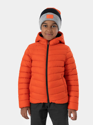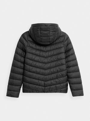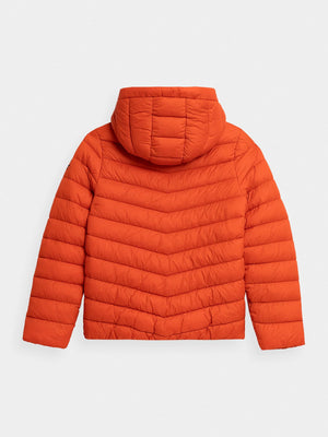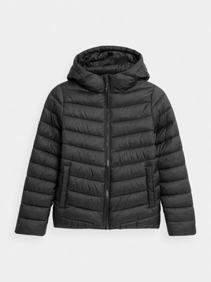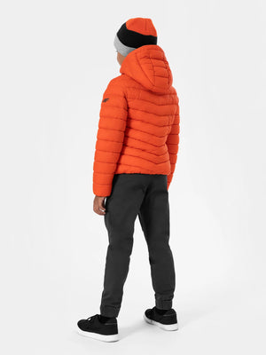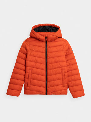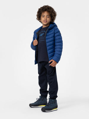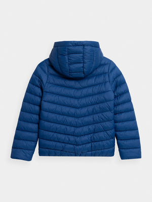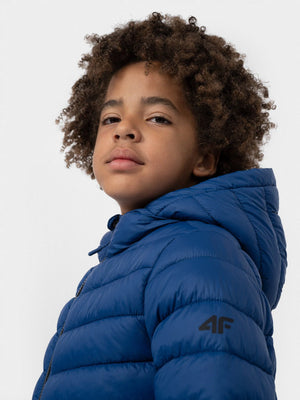 Boys' quilted down jacket. We made it from a soft material with the lightweight synthetic down filling. It has a comfortable, non-removable hood and two front pockets where your child can hide the necessary small accessories. The jacket will provide optimal protection against the cold in the transitional period.