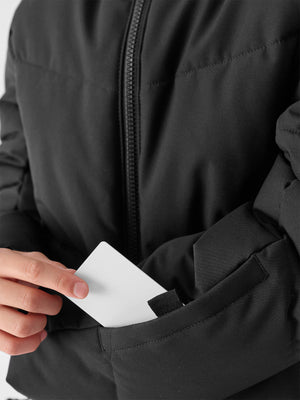 The bottom circumference can be adjusted using a tunnel drawstring with stoppers. The whole is completed by an integrated snow belt with circumference adjustment using snaps, which prevents snow from getting inside.