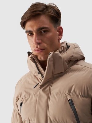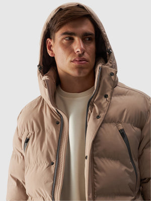 The men's hooded down jacket features a detachable hood with volume adjustment. The neck is covered by a high collar for extra protection from the cold and wind. The sleeves are finished with non-adjustable cuffs. Extended inner knit cuffs protect the wrists from cold winds.